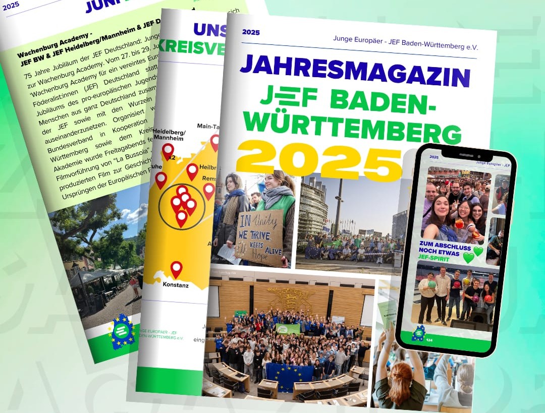 Die JEF ist ein pro-europäischer und überparteilicher Jugendverband, der seit 75 Jahren in über 35 Ländern aktiv ist. Unter unserem Motto “Europa erleben, Europa verstehen, Europa gestalten” setzen wir uns seit 1949 für ein demokratisches und föderales Europa ein. Unsere Arbeit gliedert sich in drei verschiedene Bereiche: Bildungsarbeit, politische Arbeit und internationaler Austausch durch Fahrten und Twinning-Programme. Damit bringen wir jungen Menschen Europa vor Ort näher, entwickeln aber auch gleichzeitig Ideen und Konzepte, wie man die EU weiterentwickeln und verbessern kann. In Baden-Württemberg sind über 1.050 Mitglieder bei der JEF in 24 Kreisverbänden vor Ort aktiv. Unsere Mitglieder sind junge Menschen bis 35 Jahre.